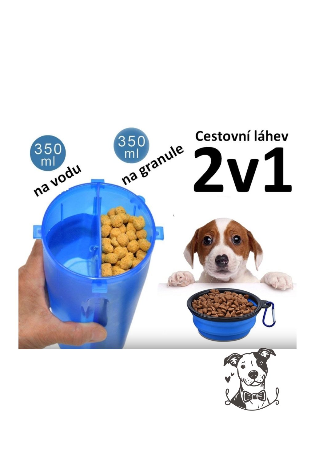 Praktická cestovní láhev 3v1 s dvojitou nádobou na vodu a krmivo a skládací silikonovou miskou. Ideální na cesty se psem či kočkou – lehká, kompaktní a snadno omyvatelná. Objem 700 ml (2× 350 ml), barva modrá.