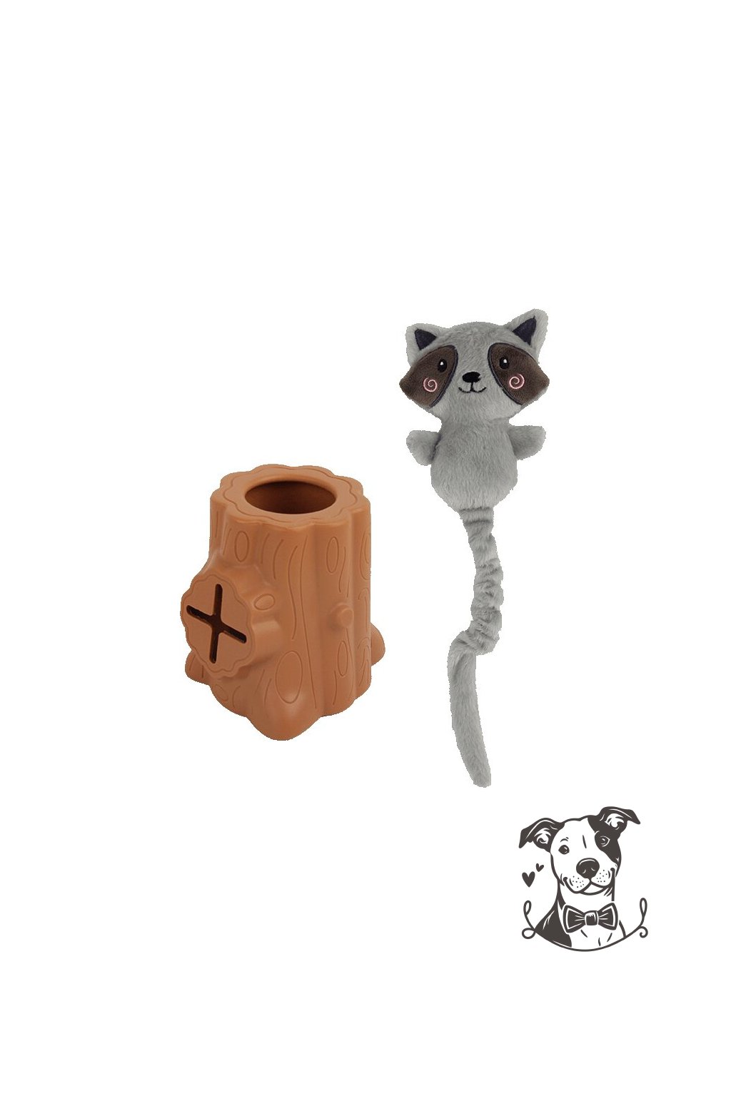 Báječná hračka na nosework - gumová kláda s roztomilým plyšovým mývalem.