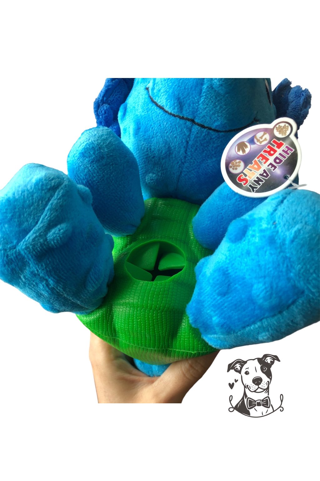 Jde o plyšovou hračku s pevným gumovým tělem a speciálním otvorem na pamlsky. A vydolovat je odtud není vůbec jednoduché!