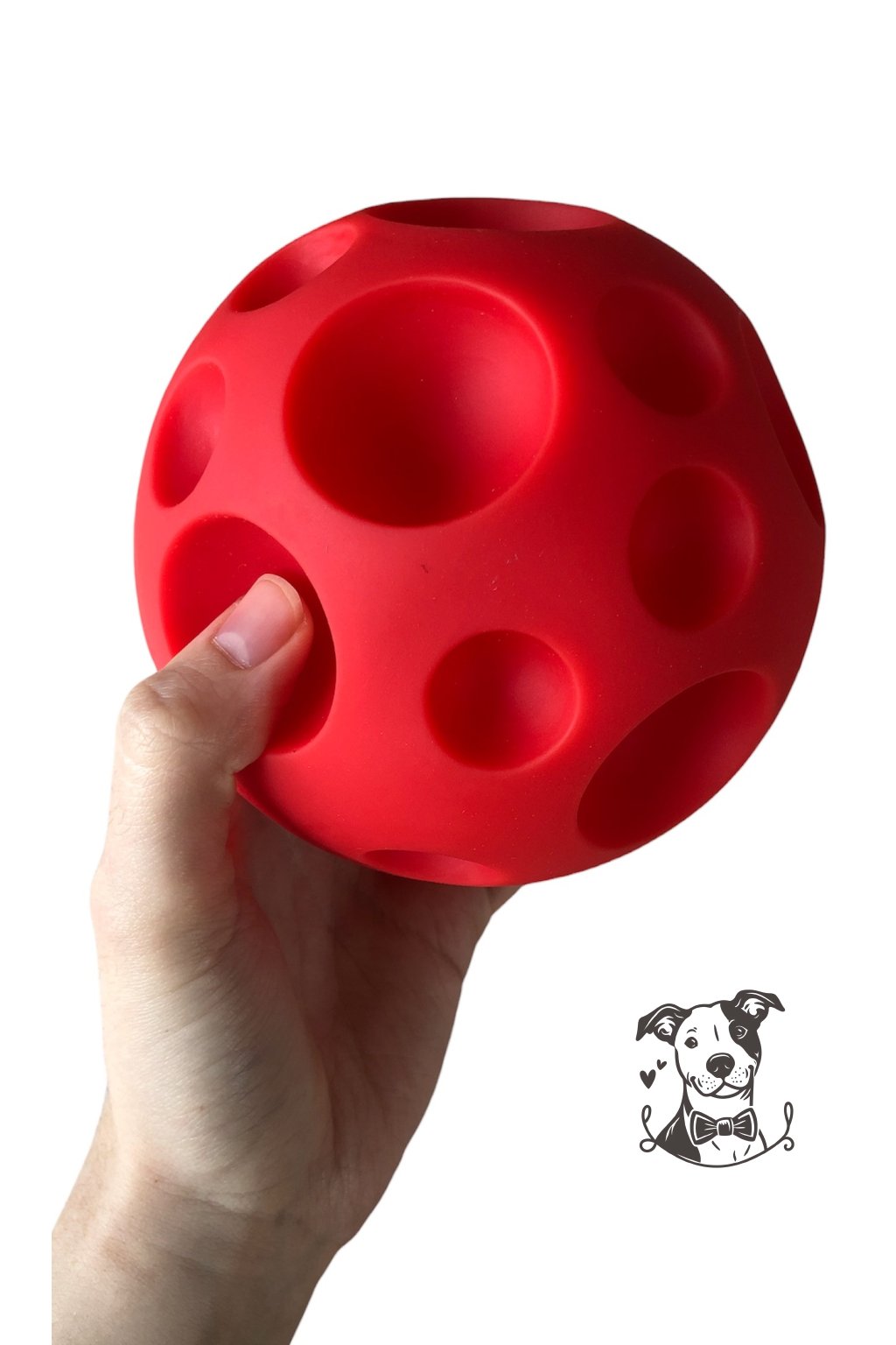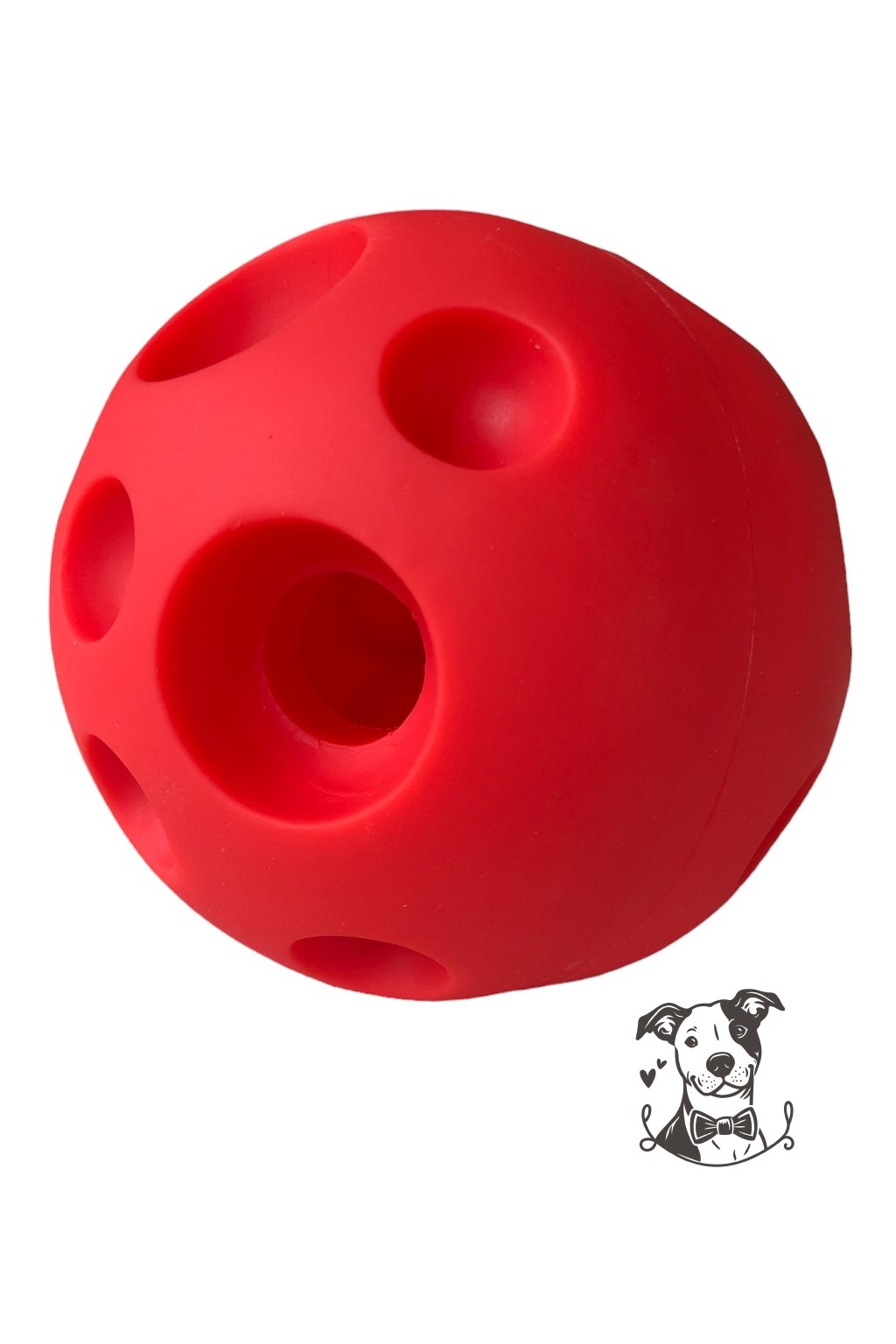 Interaktivní míč na pamlsky z vinylu nabízíme v tmavě červené barvě.
