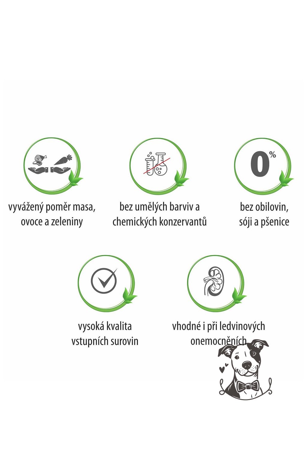 - Transparentní složení bez obilovin, barviv, chemie, dochucovadel, sóji, soli, chemických konzervantů a GMO