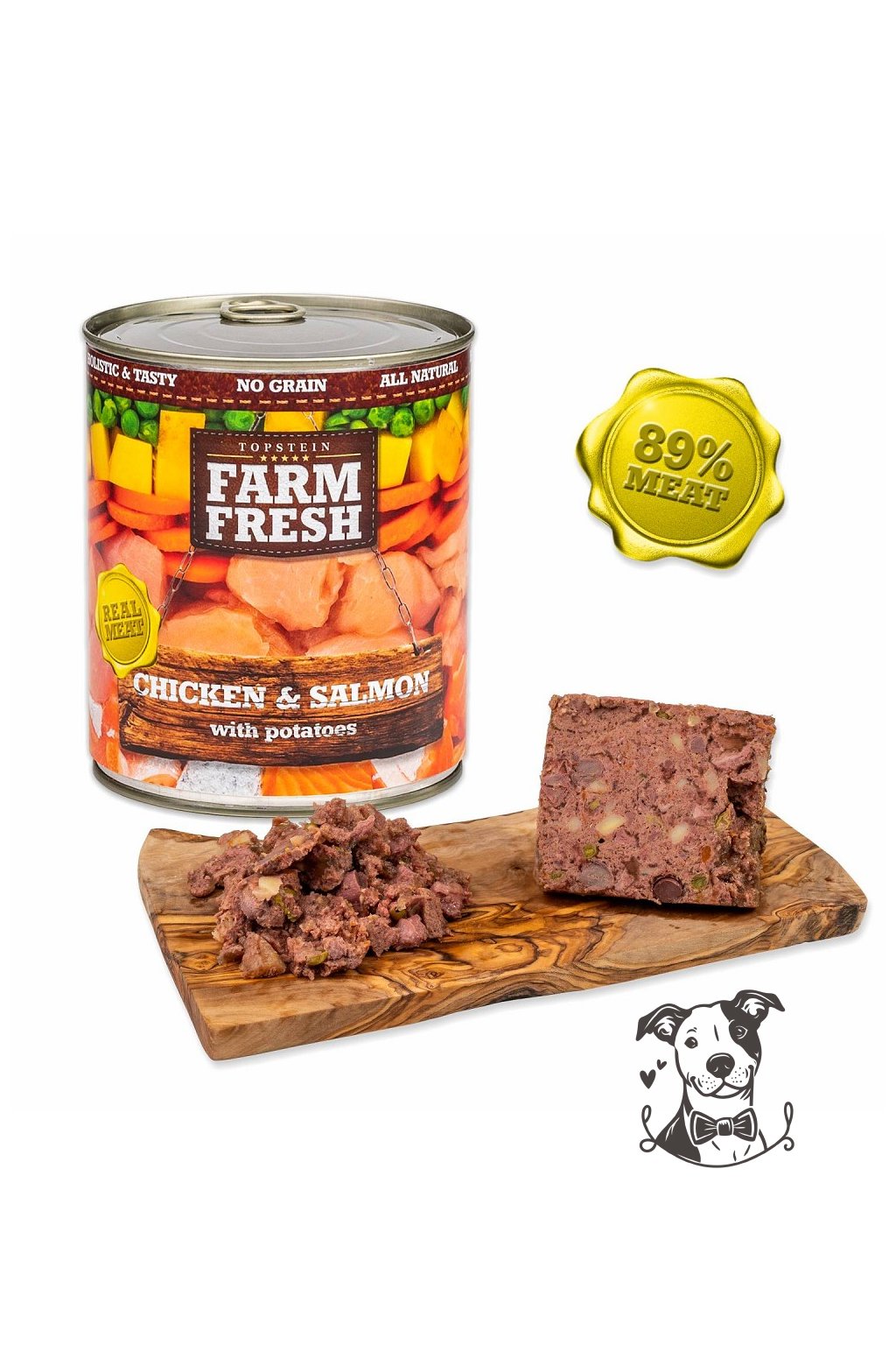 Složení: Maso z kuřete a lososa a jejich vedlejší produkty živočišného původu, brusinky 5%, mrkev 3%, hrášek 2%, minerální látky 1%, slunečnicový olej 0,2%.