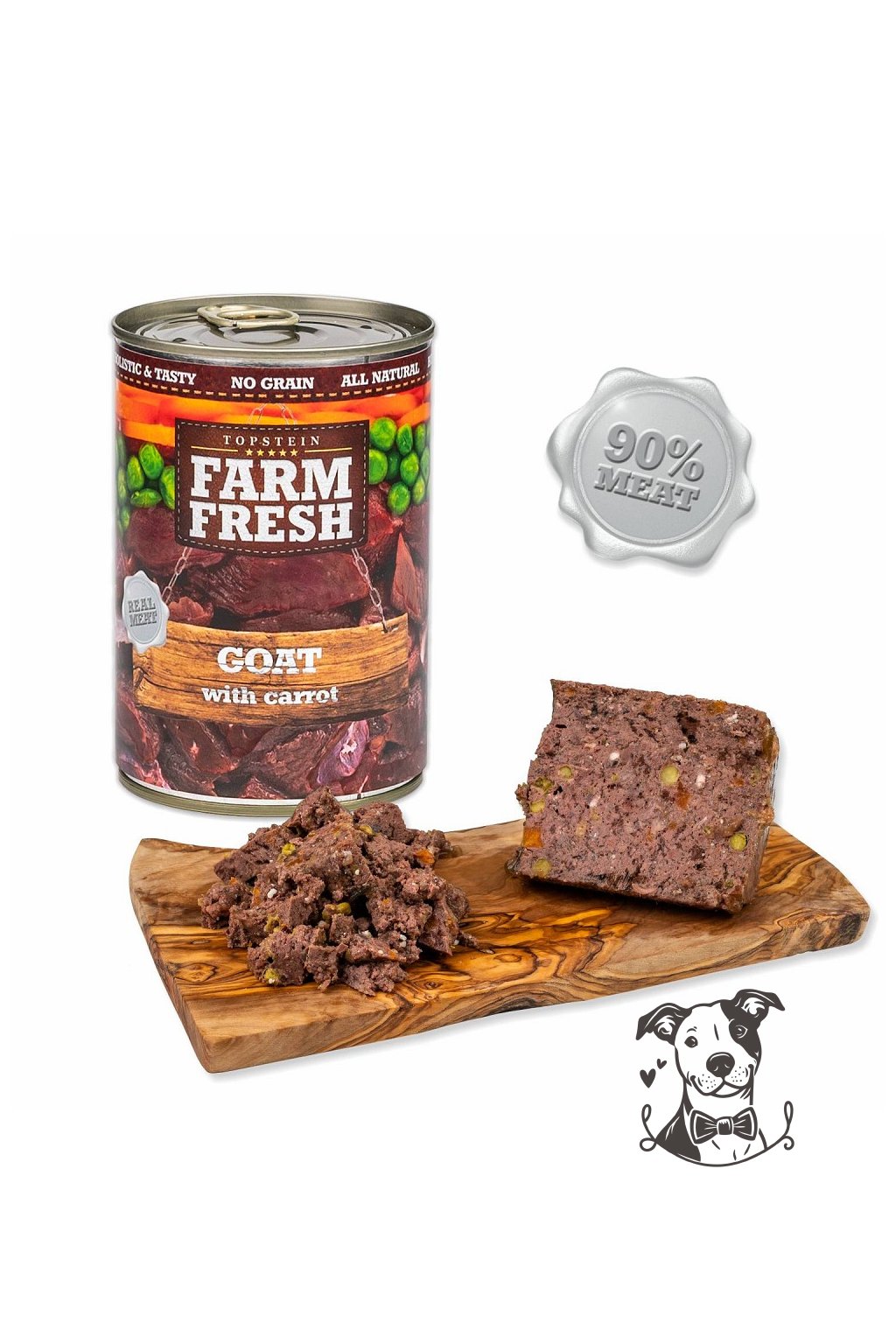 Složení: Maso z kozy a její vedlejší produkty živočišného původu, mrkev 5%, hrášek 4%, minerální látky 1%, slunečnicový olej 0,2%.