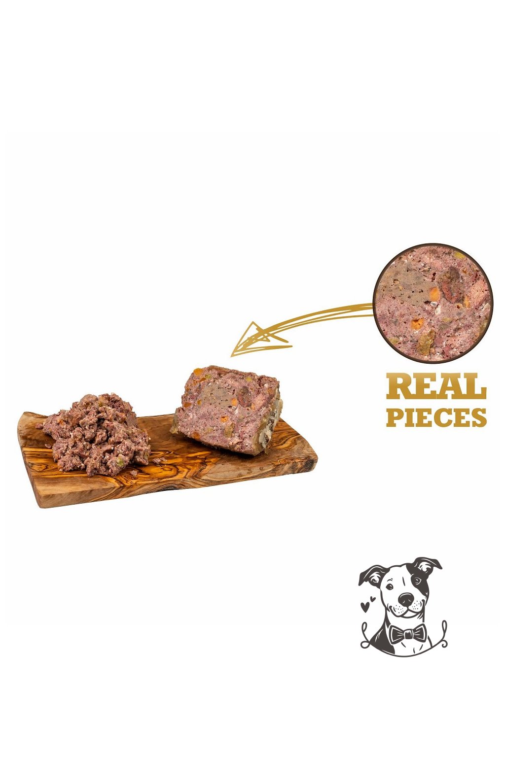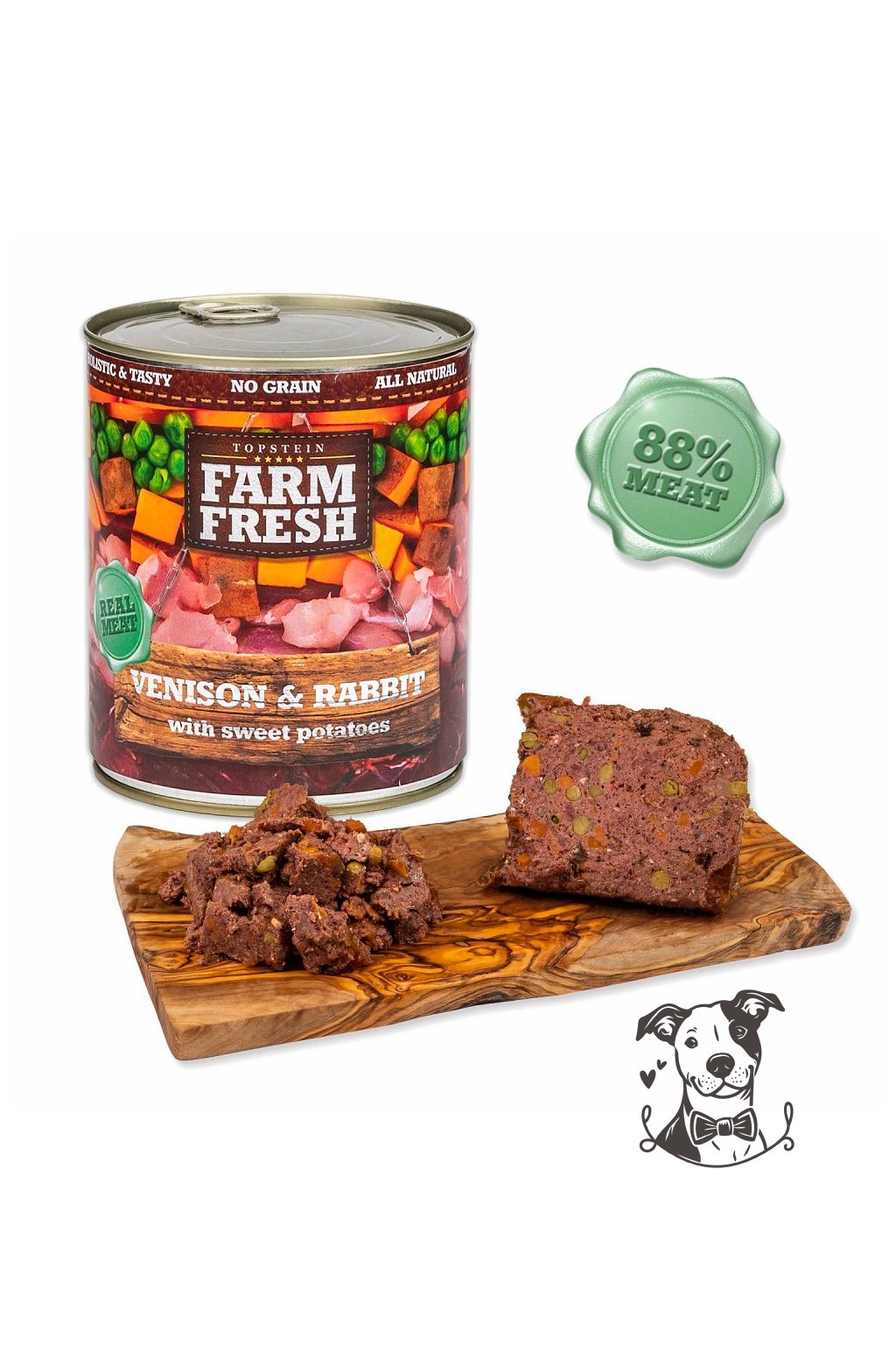Složení: Maso ze zvěřiny a králíka a jejich vedlejší produkty živočišného původu, batáty 5%, mrkev 3%, hrášek 2%, minerální látky 1%, slunečnicový olej 0,2%.