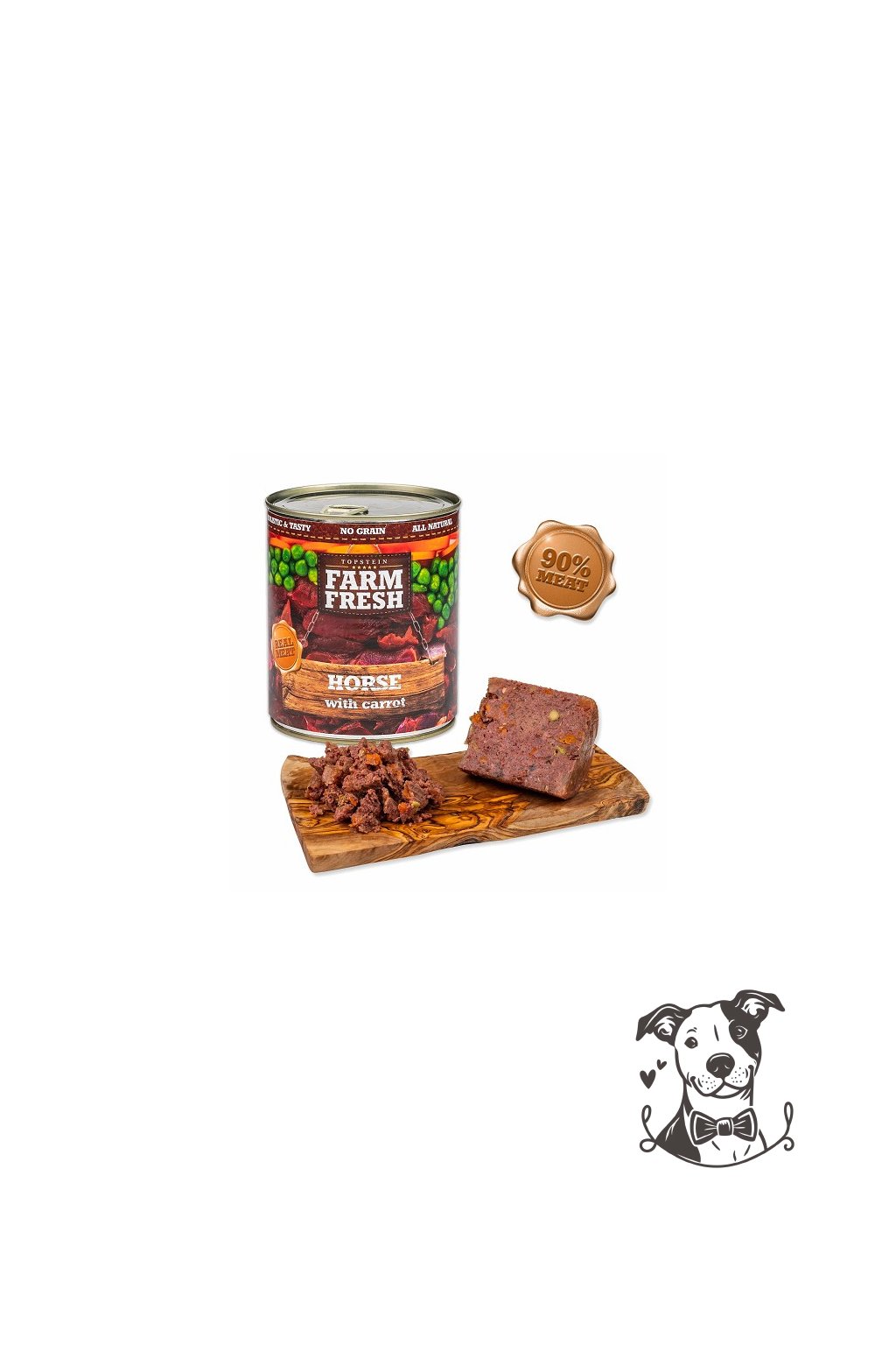 Složení: Maso z koně a jeho vedlejší produkty živočišného původu, mrkev 5%, hrášek 4%, minerální látky 1%, slunečnicový olej 0,2%.