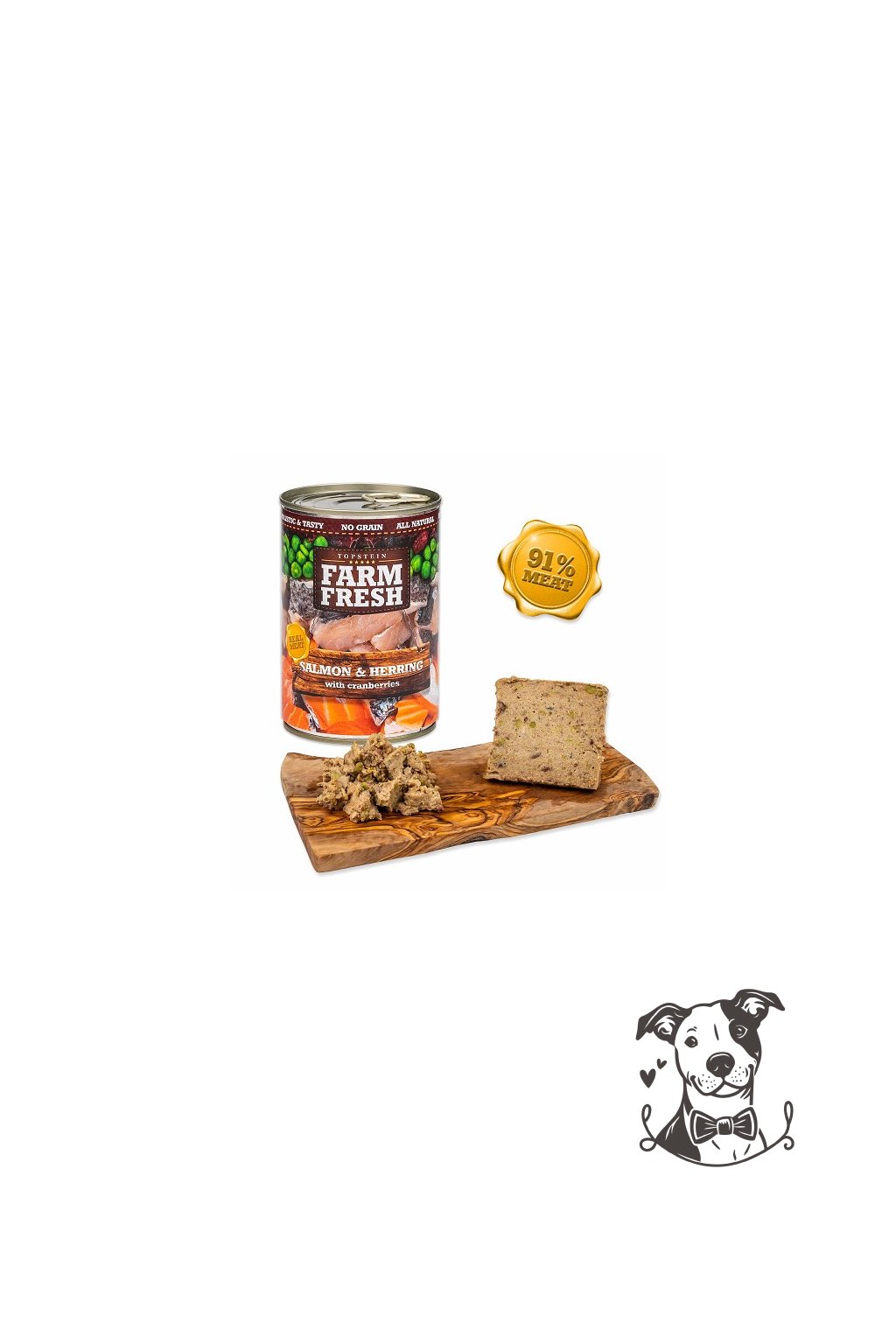 Složení: Maso z lososa a sledě a jejich vedlejší živočišné produkty, hrášek 5%, brusinky 3%, minerální látky, oleje a tuky (lososový olej) 0,2%.