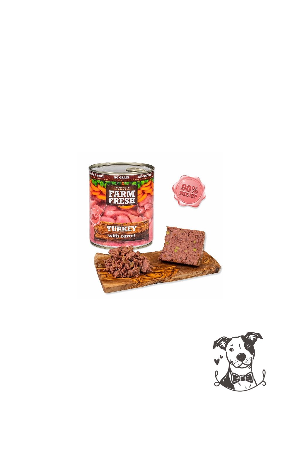 Složení: Maso z krůty a její vedlejší produkty živočišného původu, mrkev 5%, hrášek 4%, minerální látky 1%, slunečnicový olej 0,2%.