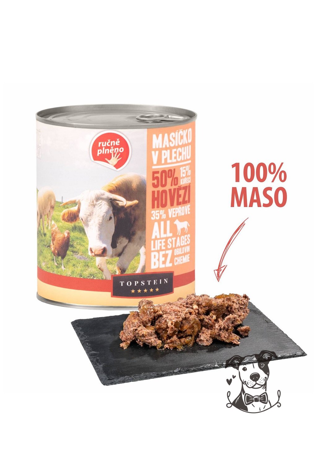Složení: Kuřecí maso 45%, vepřové maso 35%, hovězí maso 20%.