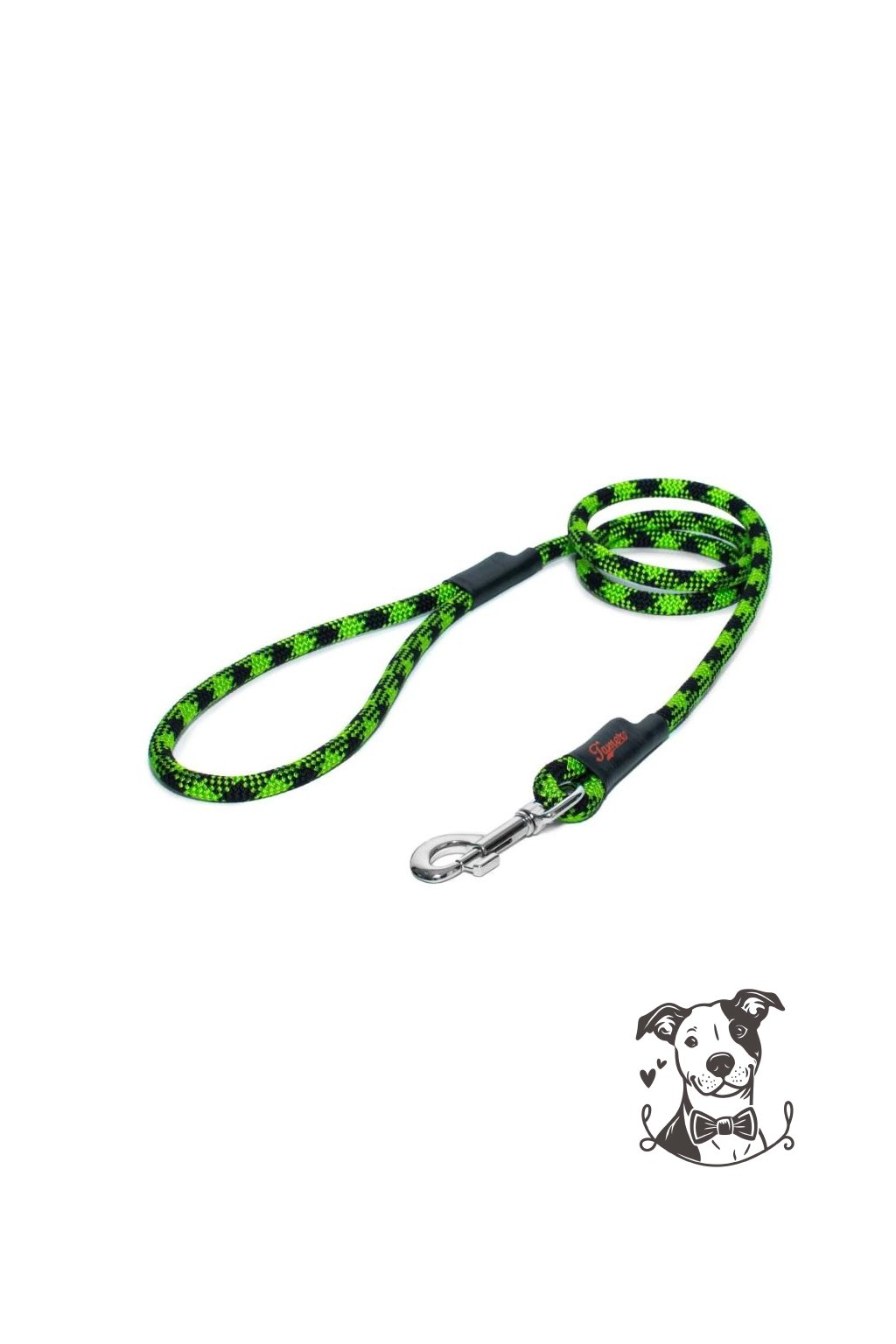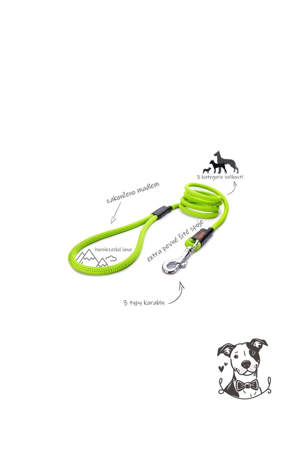 Kvalitní, ručně vyráběné vodítko zakončené uchem pro pohodlné vedení. Horolezecké lano, ruční výroba, zašité spoje a nespočet barevných variací. Potěší vás skvělé zpracování a dlouhá životnost. Uvedená velikost je idealní pro velké plemeno, řekněme 8 - 50 kg. Vždy však bude záležet na preferencích páníčka a tělesné konstituci chlupáče.