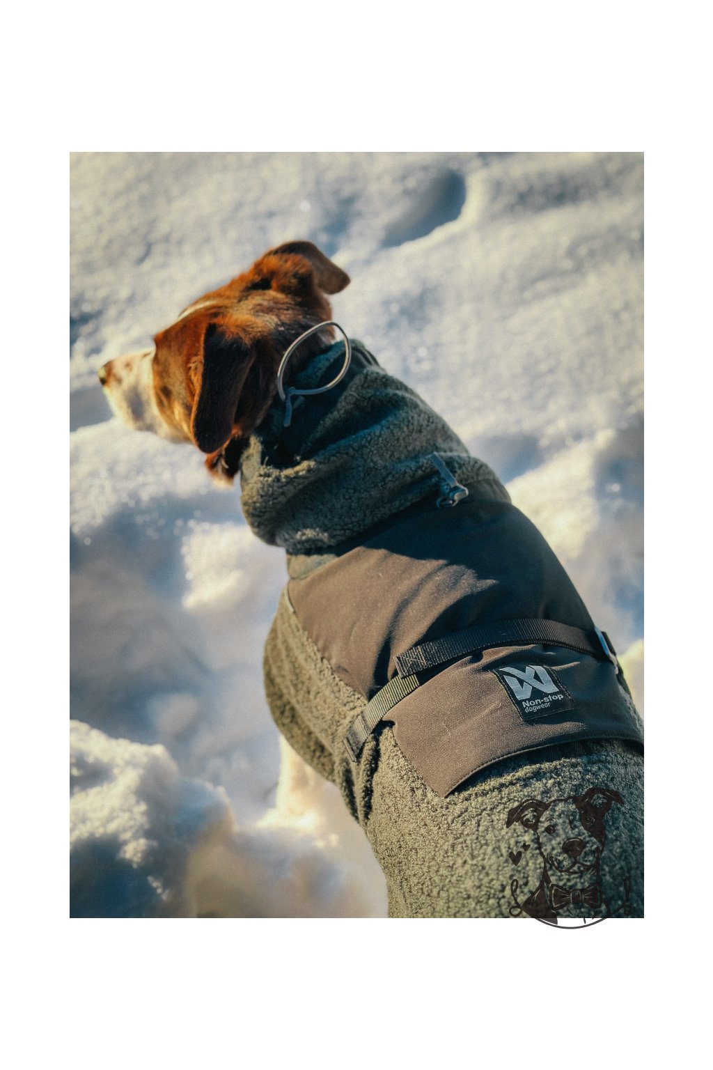 Vynikající vlastnosti merino vlny a odolnost polyesteru: to je bunda Wool dog jacket. Merino vlna je přírodní vlákno, které je velmi populární pro své termoregulační vlastnosti: absorbuje vlhkost, aniž by chladlo nebo navlhlo. Díky tomu nezadržuje zápach a skvěle udržuje komfortní teplotu. Kombinace s polyesterem zase zvyšuje odolnost bundy a urychluje schnutí. Místa vystavená opotřebení jsou navíc vyztužena sofshellem. Non-stop dogwear navrhuje psí bundy tak, aby respektovaly jejich přirozený pohyb, ale zároveň pomáhaly se správnou regenerací velkých svalových partií a udržely psa v teple, i když je vystaven nepříznivým venkovním podmínkám. Bundu také můžete psovi velikostně přizpůsobit pomocí stahovací přezky kolem beder a gumiček na krku i u kořene ocasu. Pružné popruhy u zadních nohou slouží k tomu, aby bunda držela na svém místě, i když fouká vítr.