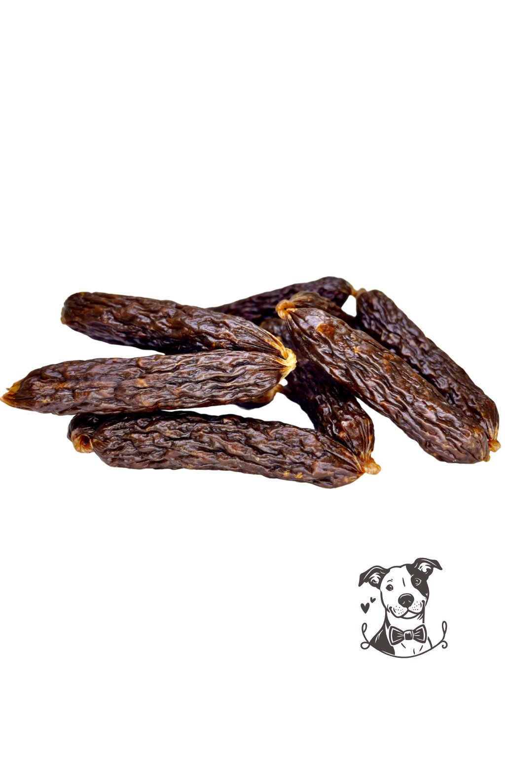 Sušené hovězí klobásky pro psy Dopřejte svému psovi lahodný a zdravý pamlsek – sušené hovězí klobásky.Vyrábíme je z kvalitního hovězího masa, bez přidaných látek a konzervantů, takže jsou vhodné i pro psy s citlivým zažíváním.