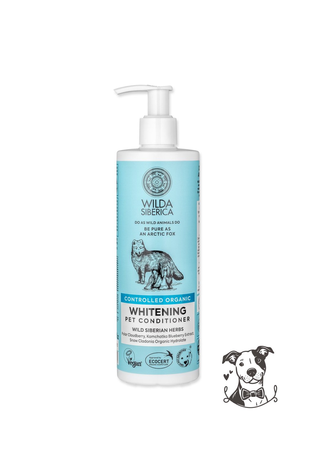 Set šamponu a kondicionéru Wilda Siberica Whitening pro psy, kočky i drobné savce s bílou srstí. Redukuje žluté tóny, rozjasňuje a vyživuje srst. Veganská receptura s bylinami ze Sibiře, certifikace ECOCERT.