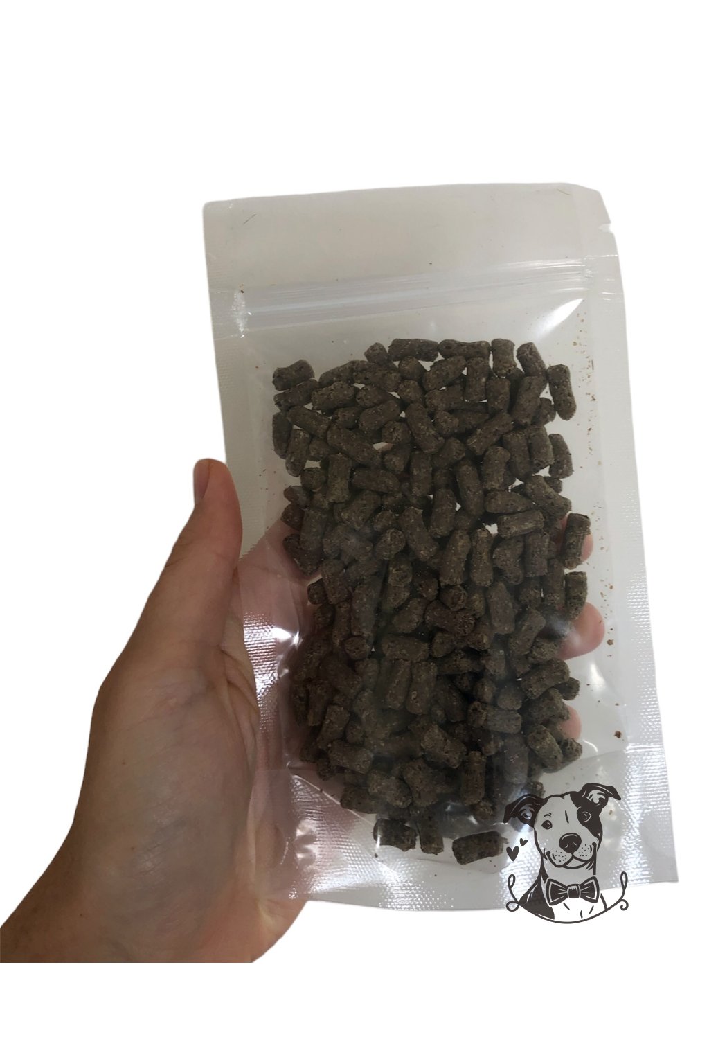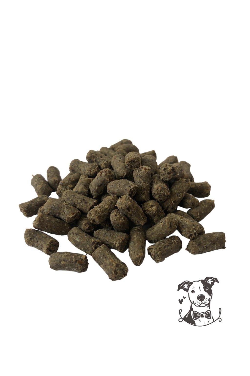 Složení: Čerstvé kachní maso a droby 30%, konopné semeno (částečně odolejované), lněné semeno (částečně odolejované), semeno světlice barvířské (částečně odolejované), maniokový škrob.